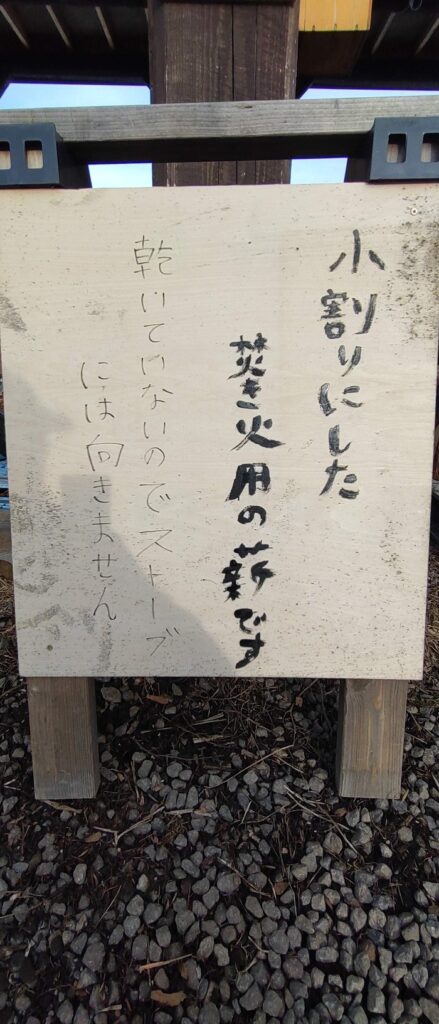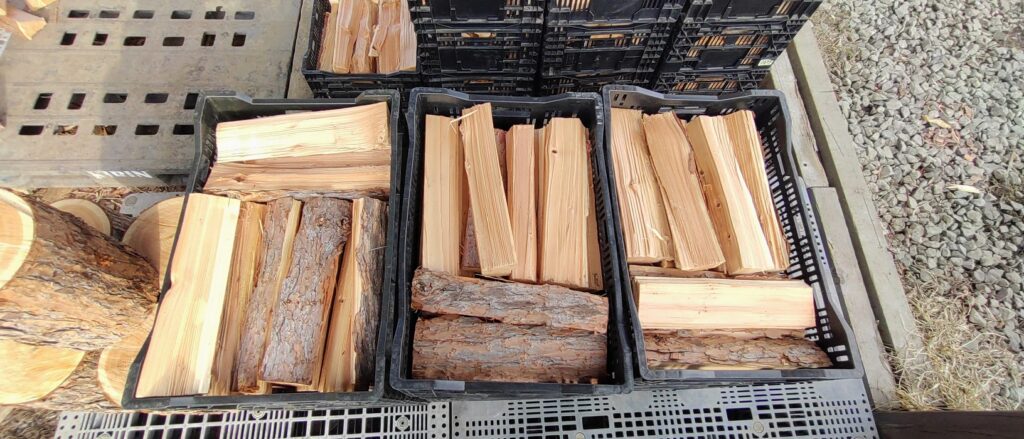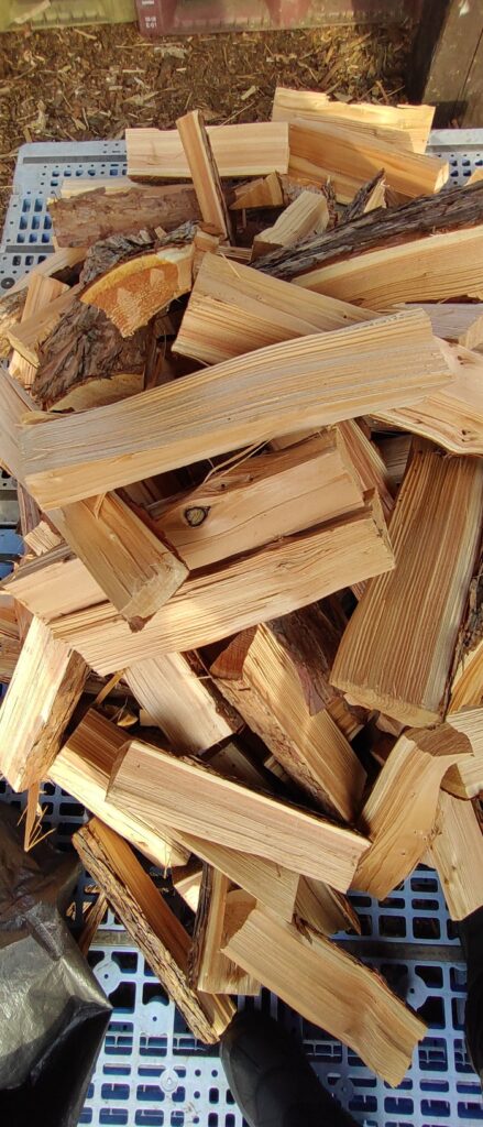 乾燥期間はほとんどなく、小割にしたものを焚き火用として販売しています。しかし、私たちは薪ストーブでも使っています。脂(ヤニ)だ煤(スス)だと気にする方も多い針葉樹ですが、手っ取り早く燃やすには申し分ないです。